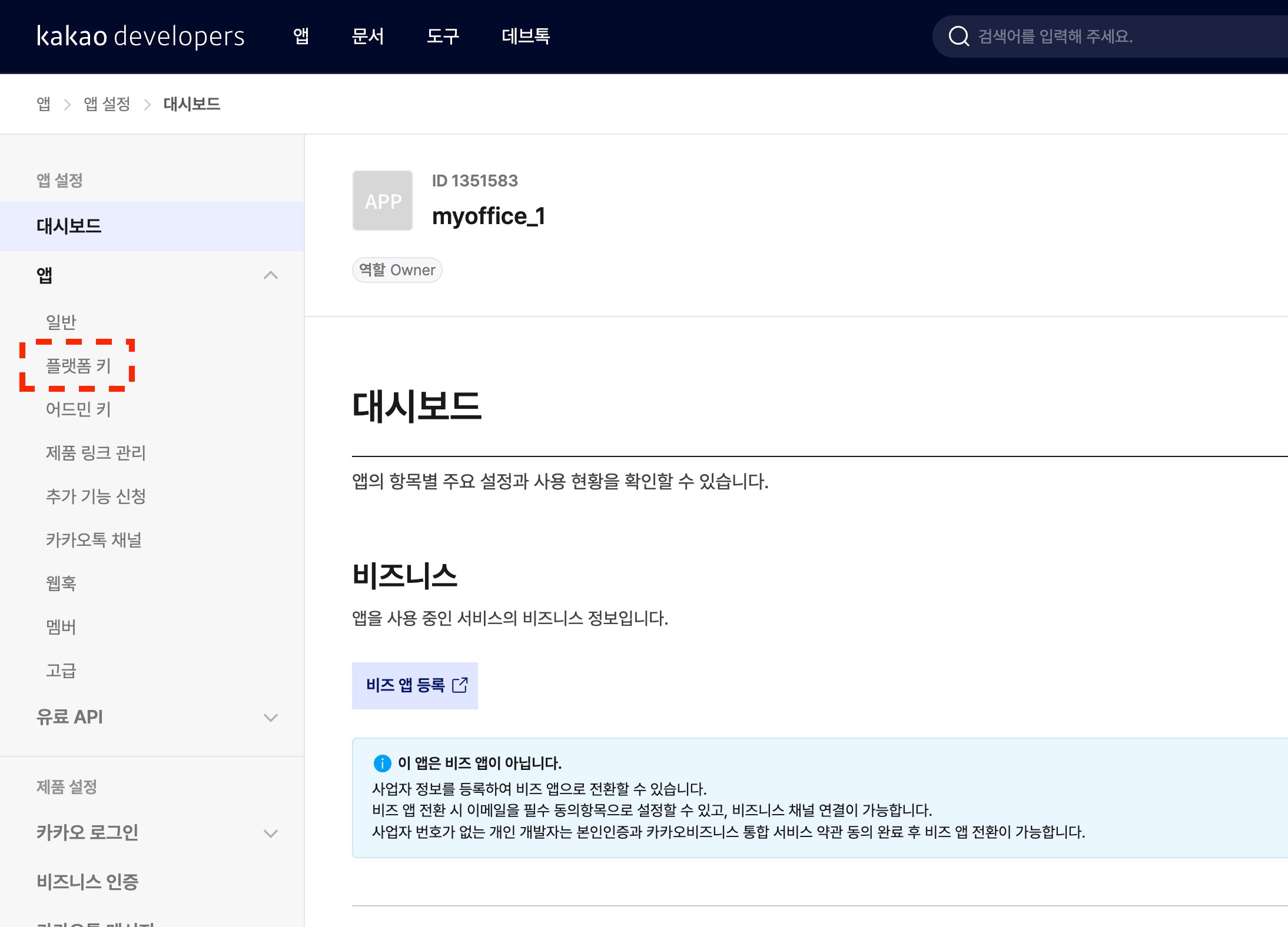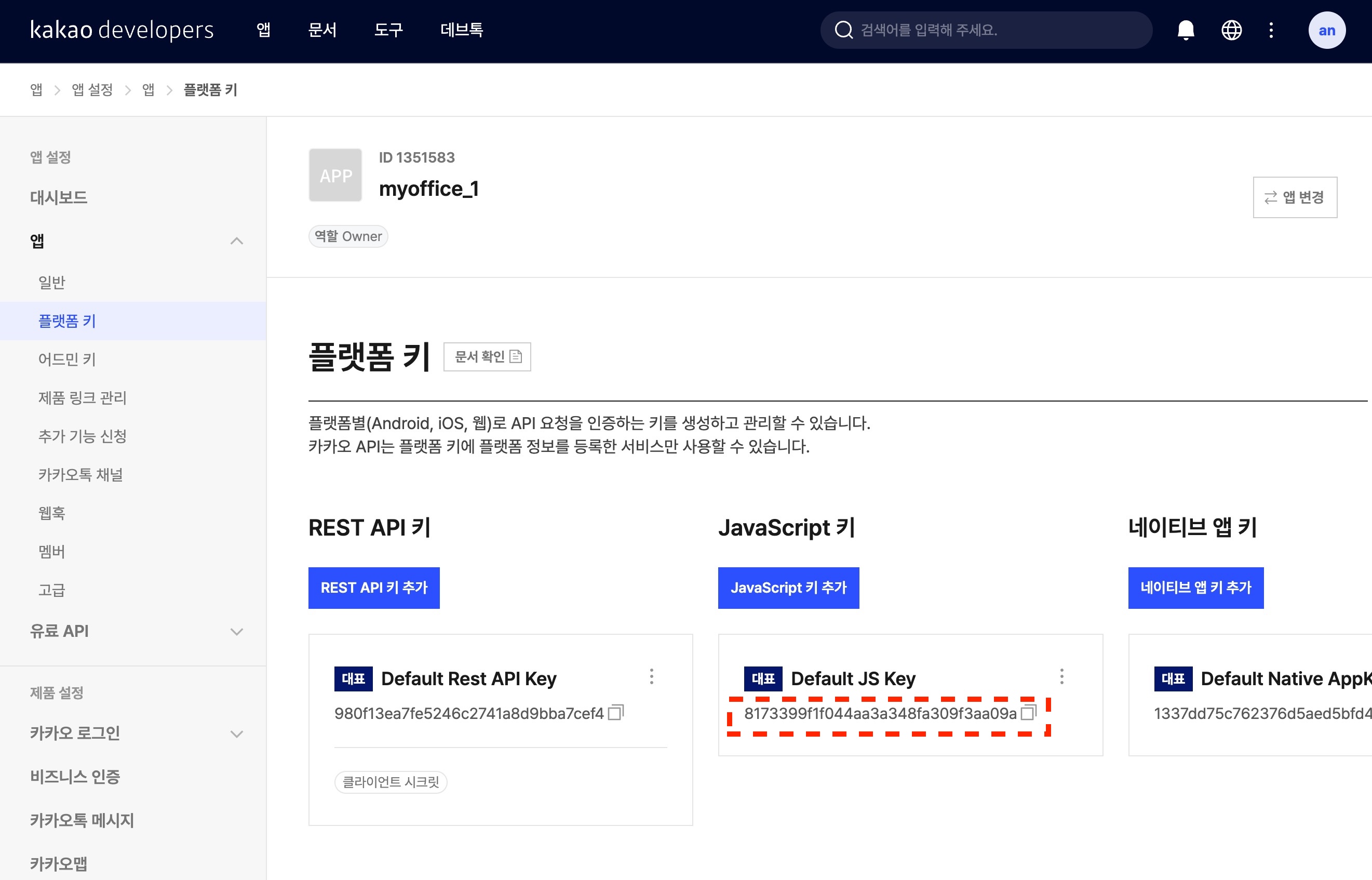 키를 확인하려면 좌측 메뉴에서 "앱>플랫폼 키"를 클릭하세요.