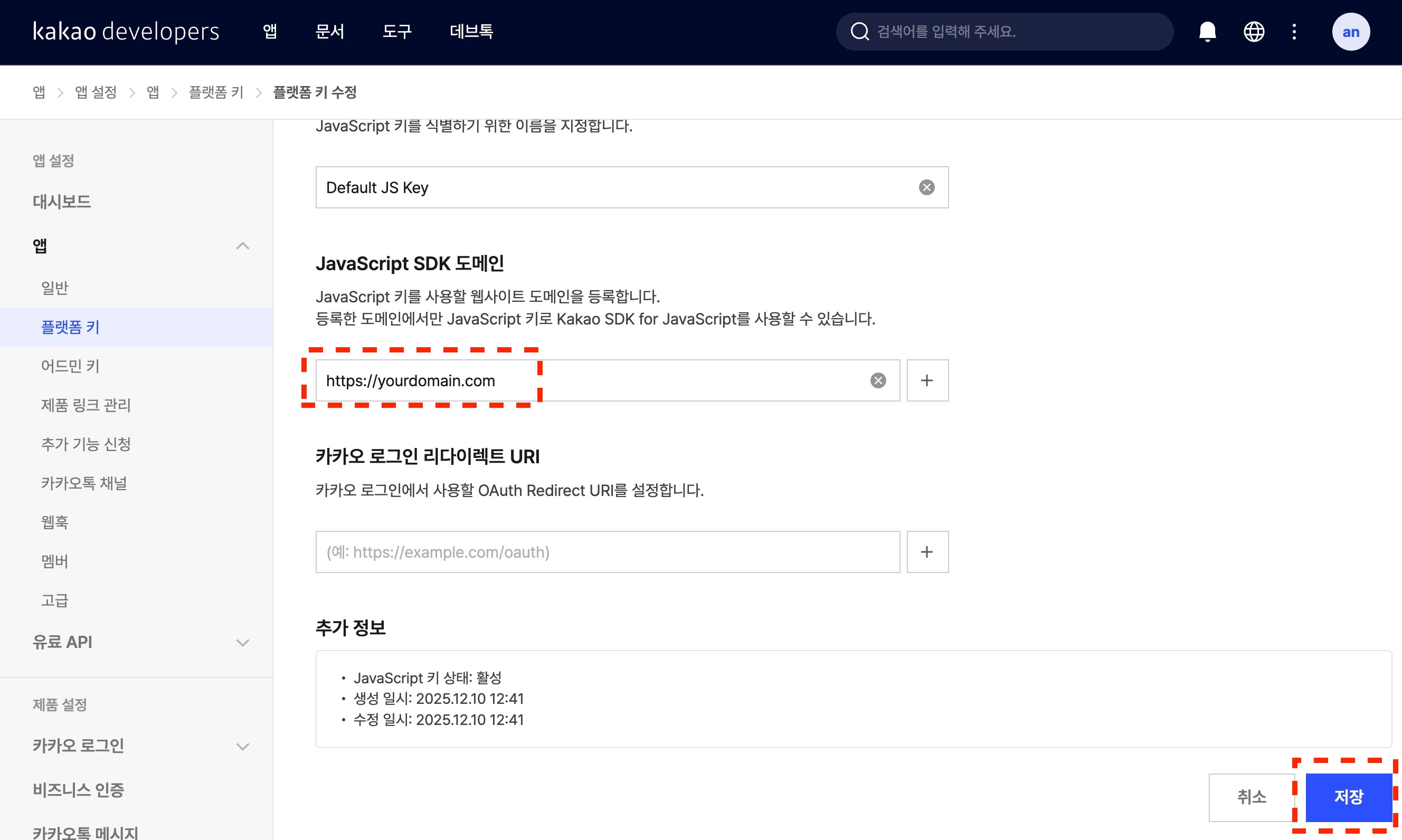 주의! 앱 대표 도메인을 입력했지만 아직 공유 API를 사용할 수 있는 것은 아닙니다.
