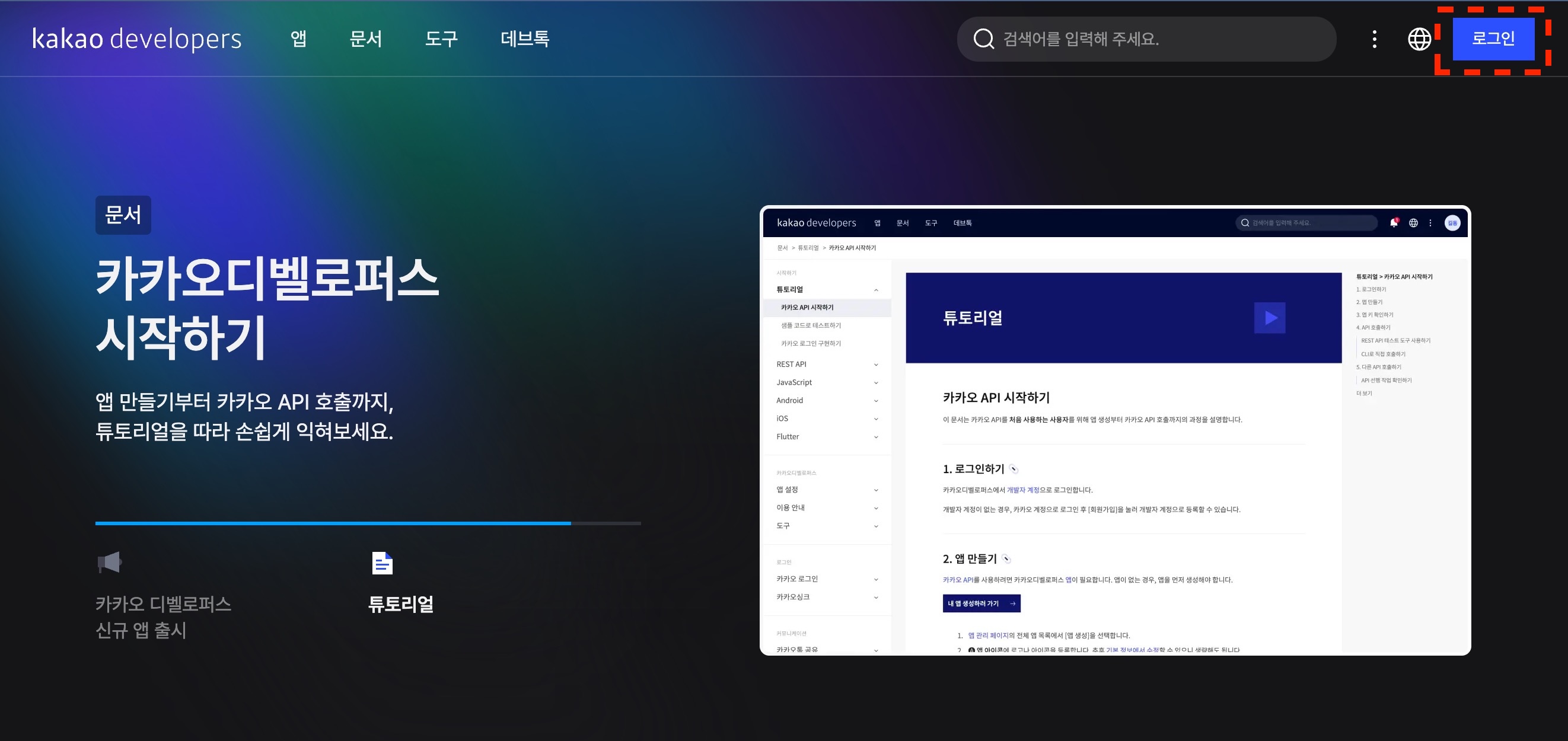 “카카오톡 개발자 사이트(Kakao Developer)“에 접속하면 우측 상단에 로그인 버튼이 보입니다.