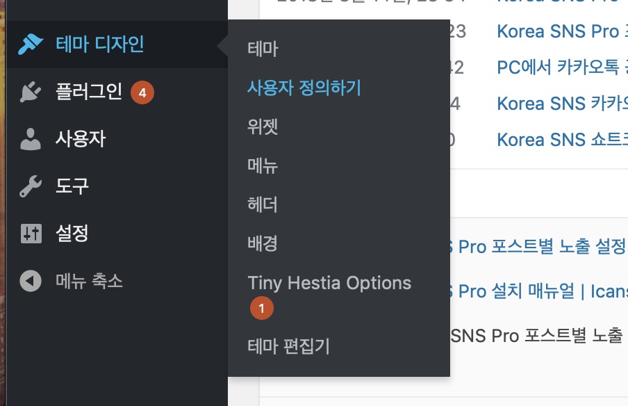관리자 계정 데시보드 메뉴에서 테마디자인 - 사용자 정의하기로 이동하세요.