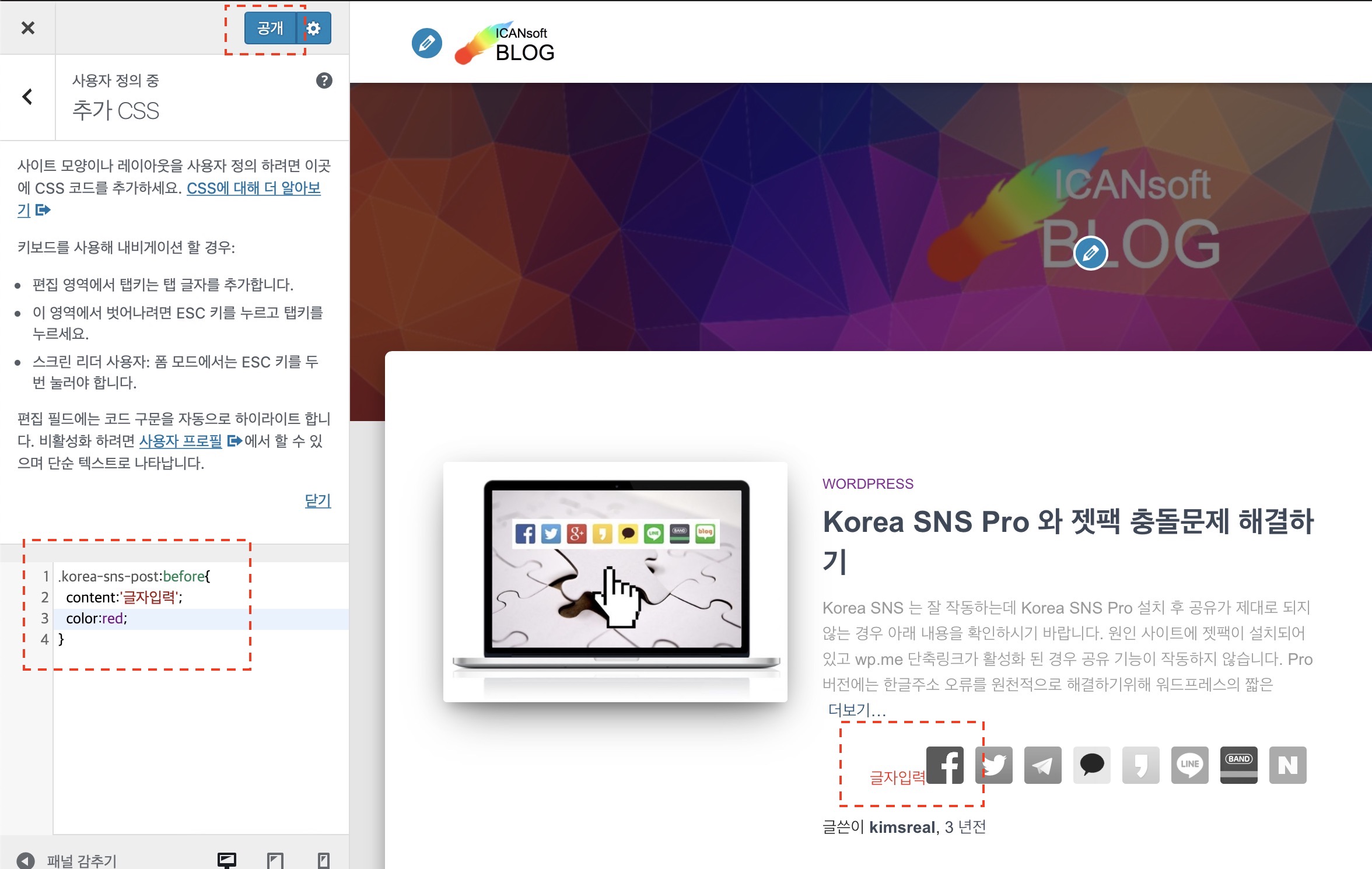 좌측 메뉴 - 추가 css를 클릭하면 아래와 같이 편집화면이 나타납니다.